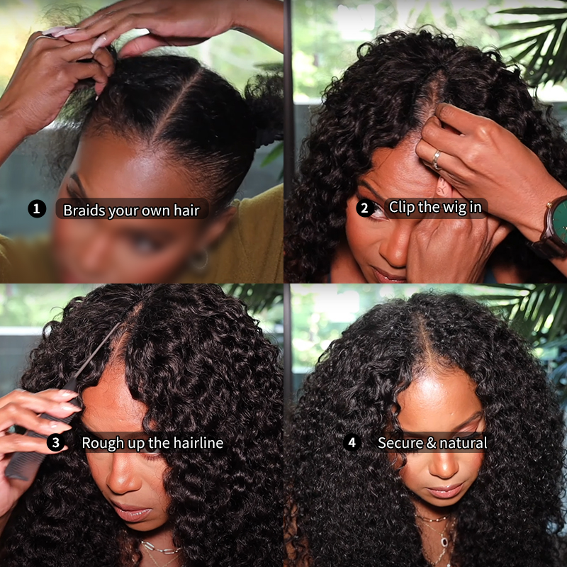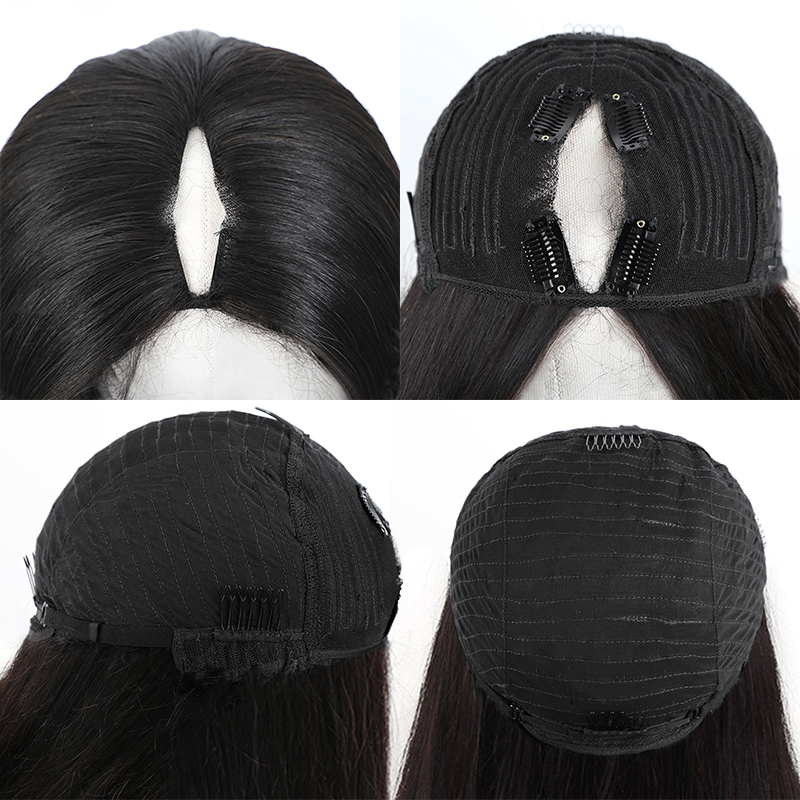V part wigs are also known as v shape wigs because they have a v-shaped opening on the top, which you can conceal with your own hair. Through the v-shaped area at the top of the wig, you may blend with your own hair to create a natural hairline. The V part wig can leave out 99% to 100% less hair than a U part wig, so it is sort of an improvement to the U part wig.